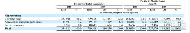 业务构成方面,小牛电动的营收主要分为车辆销售、配件和零部件销售,以及服务三部分,其中车辆收入占据营收绝大部分,配件/零部件收入2016、2017和2018年上半年分别为1492万、4915万和3556万。