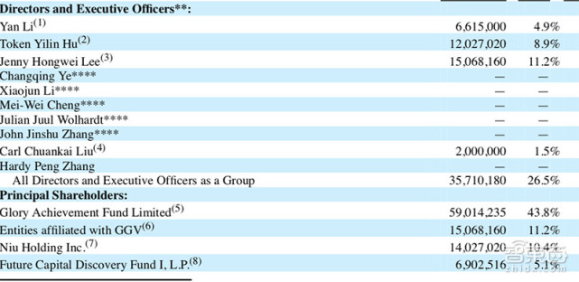 招股书文件显示,小牛电动的机构股东依次为Glory Achievement Fund Limited(占股43.8%)、GGV纪源资本相关实体(占股11.2%)、小牛控股(占股10.4%)、Future Capital Discovery Fund I, L.P(占股5.1%)。